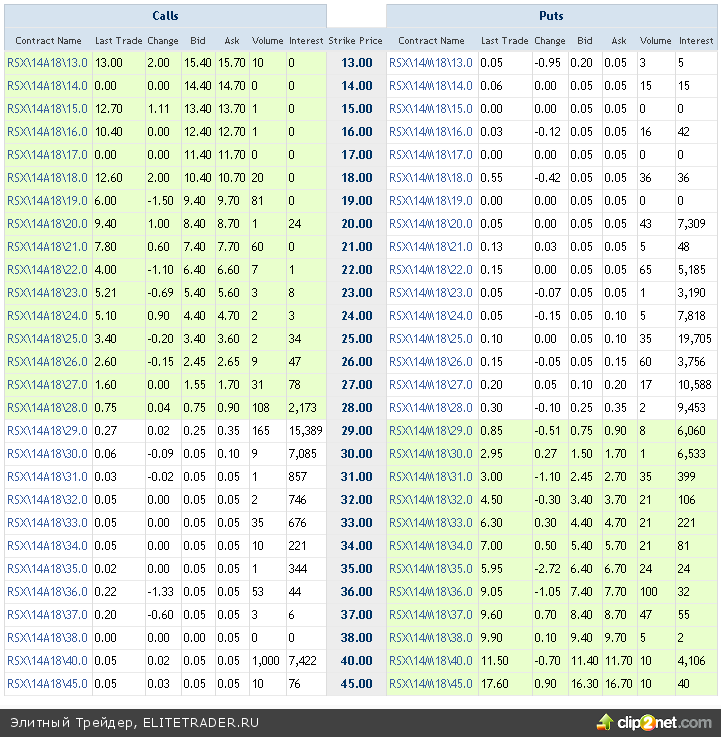 По поводу вчерашней идеи на предмет опционов на ETF RSX привожу скриншоты опционной доски. Серьезных выводов делать не буду, так как истории данного инструмента у меня нет.