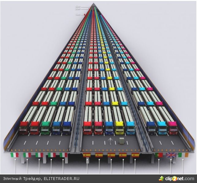 Дефицит бюджета Греции составляет 24,125,000,000 евро. Поэтому в этом году, чтобы не обанкротиться, Греции необходимо занять 12 таких грузовиков, наполненных банкнотами в сто евро.