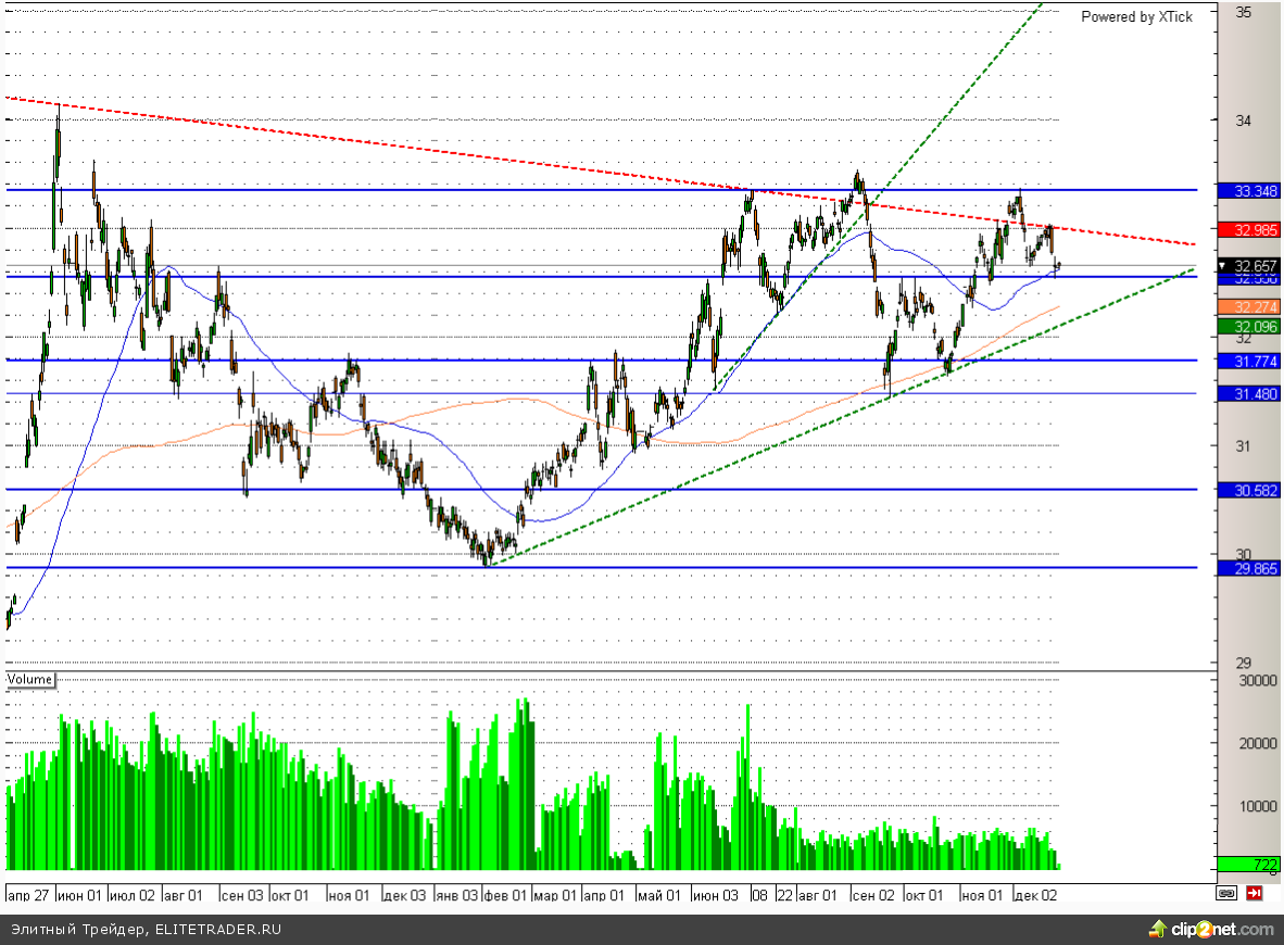 Рубль растет к доллару на 2 копейки. Данная валютная пара торгуется в диапазоне между 32,55 и 33 вот уже второй месяц. Пробой любого из данных уровней может стать сигналом к более сильному движению, но драйверы для этого пока отсутствуют. Сейчас продолжению боковой динамики способствуют несколько противоборствующих факторов. За рост российской валюты по-прежнему выступают высокие цены на нефть, а также интервенции ЦБ РФ в размере 200 млн долларов на текущих уровнях. В свою очередь снижению может способствовать начало сокращение стимулирующих программ в США, а также уменьшение спроса на рубли из-за окончания налогового периода в стране.