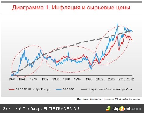 Рост цен на сырьевые товары, произошедший за последнее десятилетие, имеет прямую аналогию, а именно – нефтяной шок 1973 года и последовавшие за этим события. Тогда рост сырьевых цен подстегнул инфляцию, способствовал окончательному отказу от золотого стандарта и поменял принципы мировой денежной системы. С начала 1980х по начало 2000х цены на сырье двигались в рамках бокового тренда, хотя и колебались в широком диапазоне. Разрыв с потребительскими ценами нарастал.