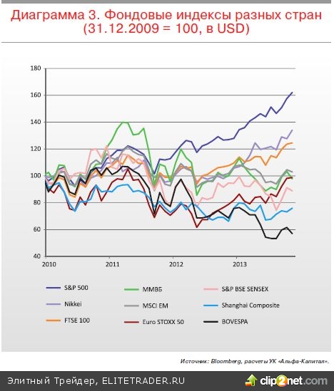 Дивергенция экономик напрямую сказалась и на динамике фондовых индексов. В лидерах, как легко догадаться, США, а в последние годы стала подтягиваться Япония. В аутсайдерах – Бразилия, Индия и Китай. Россия находится гдето в середине этого списка