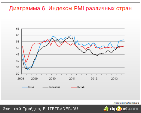 Скорее всего, рост экономики в 2014 году будет слабым, но одновременно мало кто ожидает скатывания ее в рецессию. Наоборот, есть предпосылки ускорения роста в развитых экономиках: например, индексы PMI США и еврозоны явно развернулись наверх. Что касается развивающихся стран, то им, с одной стороны, требуется время для решения внутренних проблем, с другой – для них развитые страны становятся уже не столько локомотивами, сколько конкурентами.