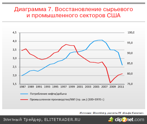 Развитые страны: из локомотивов в конкуренты Одно из значимых изменений в структуре мировой экономики, которое напрямую касается развитых и развивающихся стран, – это изменение роли отдельных стран. До недавнего времени общим мнением было то, что развитые страны – это потребители ресурсов и товаров, произведенных странамифабриками (развивающимися странами). Но эта ситуация меняется, причем достаточно быстро. Например, США активно наращивают добычу нефти, благодаря чему отношение ее потребления к добыче снизилось с 4 в 20072008 годах до почти 2,5. Кроме того, восстановление промышленного сектора привело к тому, что вклад промышленного производства в ВВП начал активно восстанавливаться после десятилетия снижения.