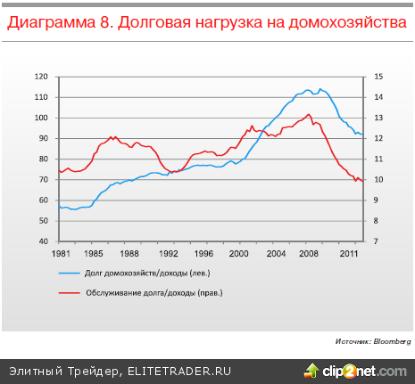 Улучшение состояния экономики положительно сказалось и на рынке труда, безработица продолжила снижаться. Кроме того, продолжило улучшаться и финансовое состояние домохозяйств, в частности снизилась их долговая нагрузка, что усилило их способность переносить. Это повышает риски начала выхода ФРС из режима сверхмягкой денежнокредитной политики. Так как ФРС однозначно будет проводить сворачивание QE с оглядкой на состояние экономики и рынка США, этот риск наиболее существенен всетаки для развивающихся рынков, так как рост ставок, скорее всего, приведет к оттоку средств с этих рынков.