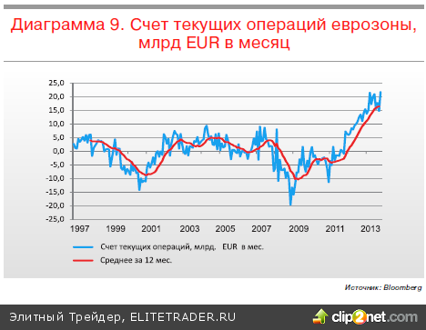 Что касается еврозоны, то здесь показательным является рост счета текущих операций до рекордного по историческим меркам значения. Конечно, во многом это произошло изза сокращения импорта, но следует отдать должное, что экспорт из еврозоны за последние годы не сильно пострадал. Формально еврозона за последние годы стала гораздо более экспортно ориентированной, чем раньше.