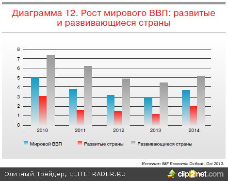 Общее состояние мировой экономики в 2013 году было «стабильным». Рост ВВП еще немного замедлился, а глобальный индекс PMI закрепился около нейтральной отметки 50 пунктов. Слабые темпы роста демонстрировали почти все регионы. Особенно разочаровали развивающиеся экономики, разница между темпом их роста и ростом развитых экономик оказалась минимальной за последние годы. Общей тенденцией 2013 года стал отток капитала из развивающихся экономик, особенно тех, которые испытывают дефицит по счету текущих операций. Идея их быстрого роста по мере сокращения демографической премии и накопления внутренних дисбалансов сходит на нет, а новой конструктивной идеи, способной заставить капитал развернуться обратно в развивающиеся рынки, пока не появилось. При этом развитые страны демонстрировали улучшение макропоказателей, улучшение в части внешних и внутренних дисбалансов. Особенно это заметно на примере еврозоны, где наблюдается рекордное положительное сальдо по счету текущих операций и уменьшение бюджетных дефицитов.