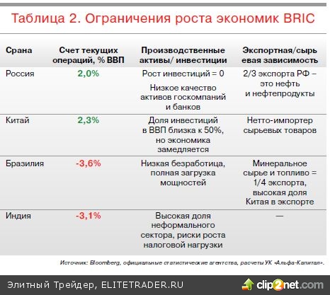 В 2014 году добавится еще одна проблема – качество активов, причем в разных секторах. В банковской сфере быстрый рост потребительского кредитования привел к увеличению объема просроченных кредитов. Последующее замедление роста портфеля и его «старение» привели к лавинообразному росту просрочки и падению показателей достаточного капитала банков. В результате ЦБ пришлось активизировать зачистку банковской системы… И этот процесс продолжится. Второй источник формирования плохих активов – инвестиции, осуществлявшиеся в рамках государственных программ. Это касается олимпиады в Сочи, в которую инвестировали госбанки, а также проекты развития, финансируемые ВЭБ. В случае с ВЭБ высокая доля кредитов, выданных вопреки сопротивлению инвестиционного комитета, а также финансирование олимпийских строек привели к необходимости докапитализации этого института развития. Третья сфера, где высока доля плохих активов, – это металлургия. Компании активно инвестировали в развитие производства на пике цикла, при других ценах на металлы. При текущих же ценах отдача от них совсем не такая, как планировалось. С учетом вышесказанного мы прогнозируем рост экономики РФ в 2014 году в размере всего 1% в базовом варианте.