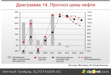 Остается надеяться, что Саудовская Аравия продол жит играть роль балансира рынка нефти и будет корректировать объемы добываемой нефти для того, чтобы держать цену нефти около «оптимального» уровня в 100 долл. На следующий год мы ожидаем среднюю цену за год в диапазоне 100110 долл., а в 2015 году – 95105 долл. При этом downside риски существенно выше, чем upsideриски.