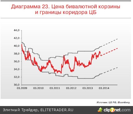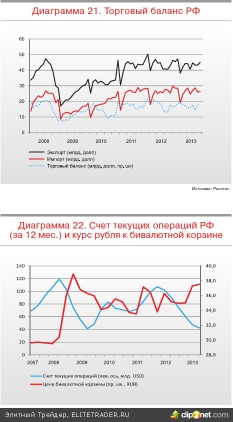 Исходя из предположения сохранения цен на нефть на текущих уровнях 100110 долл. за баррель (в базовом прогнозе), российский экспорт в 2014 году не вырастет. Это отчасти будет компенсировано слабыми показателями внутреннего потребления и инвестиций, которые будут означать и низкий темп роста импорта. Как следствие, торговый баланс РФ если изменится, то не очень значительно. Счет текущих операций, включающий в себя помимо чистого экспорта еще и процентные платежи, чистые платежи за услуги и т.п., также пока останется в плюсе. Сальдо по счету текущих операций по итогам 2014 года мы ожидаем на уровне 20,0 млрд долл., то есть ниже показателя ожидаемых по итогам этого года 35 млрд. Что касается счета финансовых операций, то ожидаем его дефицит в районе 40,0 млрд долл., так как мы не думаем, что капитал в 2014 году развернется в сторону развивающихся рынков.