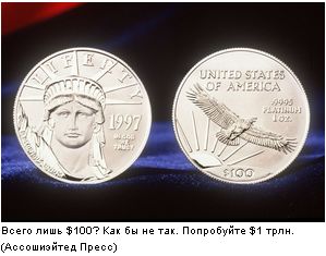 Оказывается, в законодательстве США есть прореха, позволяющая произвести платиновую монету любым номиналом. Золотую, серебряную, медную нельзя, а платиновую можно. Законом ограничено количество металлических денег, за исключением платины. Казначейство отштампует две платиновые монеты весом в 1 унцию и проставит на них номинал: 1,000,000,000,000 долларов. Всего-то. Наверное, лучше извести на монету две унции, потому что на одноунцевой будут плохо различимы нули?