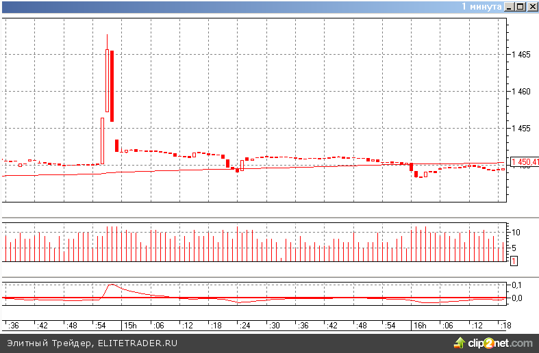 Далее рассмотрим спайке в индексе РТС в районе 14-45. Ни на одной из бумаг, которые имеют значительный вес в индексе я не нашел похожих спайков вверх. Поэтому предположу, что этот спайк — это сбой, связанные с данными по индикативному курсу доллар-рубль, который используется для расчета индекса. К сожалению, внутридневных данных по данному курсу у меня нет, поэтому свою гипотезу проверить не смогу.