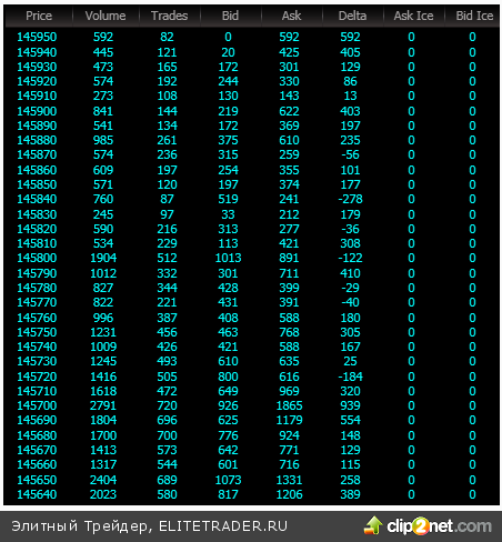 Это говорит о том, что игроки не ждут сильных движений. Предположение о локальном флэте между 144 000 и 147 000 пунктами сохраняется. Внутри дня была попытка роста, которая была сломлена о локальные продажи. На скриншоте ниже можно увидеть, что весьма активно продавали на этом всплеске активности: