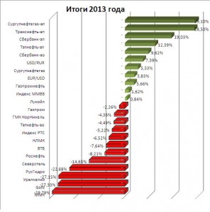 Итак, по данным, представленным биржей ММВБ-РТС, в 2013 году наибольшим спросом пользовались акции транспортных компаний (+26,46%); бумаги компаний, ориентированных на потребительский сектор (+24,13%) и акции финансового сектора (+15,97%).