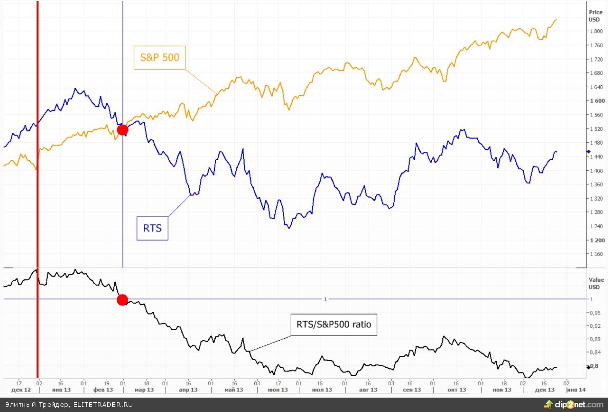 Наш долларовый РТС в 2013 году потерял около 5% (рублевый ММВБ в плюсе на 2%), тогда как американский индекс S&P 500 взлетел на 28,5%. Таким образом, традиционная модель, когда российский рынок с высокой бетой отыгрывал биржевые события за океаном, нарушилась.