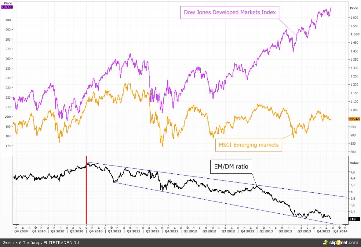 Основным источником инвестиционных рисков для российского рынка акций остается узкая сырьевая специализация экономики и соответственно ее прямая зависимость от внешней конъюнктуры. Повышенные опасения для инвесторов представляют увеличивающийся дефицит бюджета, продолжающийся отток капитала, а также рост конкуренции со стороны импорта. Денежная ликвидность, возникшая благодаря перманентной программе количественного смягчения ФРС США, осела на развитых рынках и до развивающихся, по всей видимости, дойдет не скоро. Отставание emerging markets от developed markets началось еще во второй половине 2010 года. Это четко можно видеть по снижению EM/DM ratio. Исторически так сложилось, что эти периоды обычно длятся очень долго.