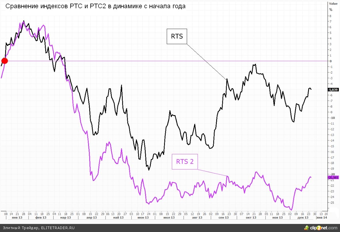 Как можно видеть, с начала этого года просадка по РТС-2 составляет около 20%, тогда как основной индекс РТС потерял всего лишь 5%.