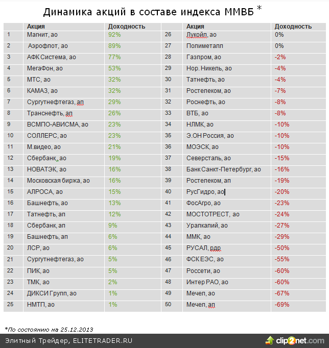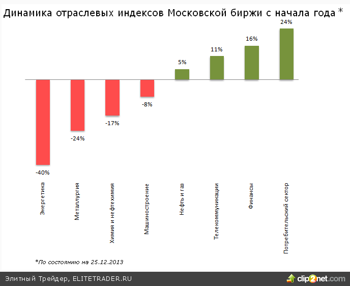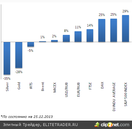 Подводя итоги прошедшего 2013 года, и обращаясь к его звездам и аутсайдерам, прежде всего, отметим, что наиболее близкий отечественному инвестору инструмент - индекс ММВБ с начала года демонстрирует весьма скромный, но все же положительный результат на уровне 2%, хотя по большому счету все это время индекс провел в боковике, итогом которого и стала подобная доходность.