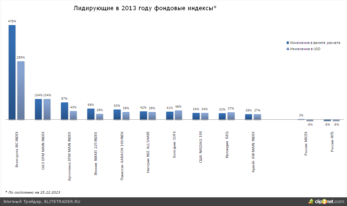 Тем не менее, среди лучших рынков в 2013 году оказались конечно не только развитые, такие как стимулируемые монетарной поддержкой Центробанков рынки США и Японии, но и конечно отдельные куда менее масштабные истории. Чего только стоит динамика абсолютного лидера - венесуэльского индекса IBC INDEX, который по доходности приближается к немыслимым 500%. Конечно если посмотреть на долларовый расчет картина будет более скромная, но в сравнении с остальными не менее впечатляющая. Как и ориентированная на нефтедобычу Венесуэла, весьма неплохо выглядели рынки арабских нефтедобытчиков.