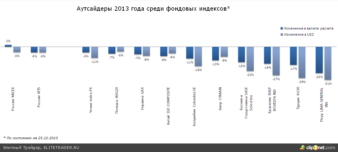 Среди аутсайдеров помимо индексов ряда стран группы BRICS включая Китай, Россию и конечно Бразилию, как видим, остались рынки стран Восточной Европы (Польши, Чехии, Украины) и Кипра. Последний в уходящем году столкнулся с обострением долгового, финансового кризиса, итогом которого стала временная парализация банковской системы, если не сказать большего.