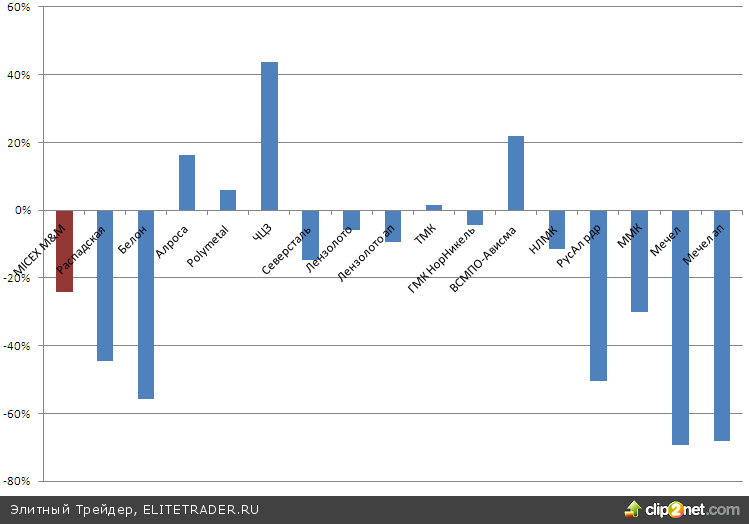 Отсюда можно непосредственно перейти к составу индекса ММВБ. В целом здесь нет каких то явных перекосов, ровно половина бумаг в плюсе, чуть меньше половины в минусе. Абсолютный лидер - акции Магнита, с ростом капитализации на 92%, компанию которым составляют Аэрофлот и АФК Система. На противоположном конце таблицы сплошь металлурги и энергетики, и замыкают ее привилегированные и обыкновенные акции Мечела с потерями в 67% и 69%.