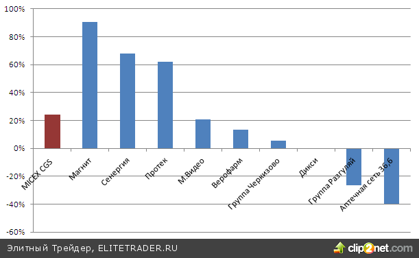 Переходя непосредственно к российскому рынку, заметим, что текущий результат, гораздо лучше той динамики, которая фиксировалась после первого полугодия по индексу ММВБ, терявшему на тот момент порядка 10%. В отраслевом разрезе на Московской бирже в лидерах роста, как и годом ранее, оказался потребительский сектор с результатом в 24% согласно индексу MICEX CGS. Здесь во многом заслуга трендовой истории акции крупнейшей розничной сети в России по количеству магазинов - Магнита. Среди аутсайдеров остались металлурги и энергетики, причем падение последних оказалось весьма впечатляющим на уровне 40%. В металлургии результаты могли бы быть и более удручающие, но частично восстановили потери вслед за отскоком цен на металлы акции сталелитейщиков Северстали, НЛМК, в отличие, например от Мечела.