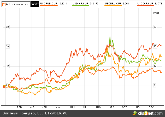 В свою очередь надо отметить, что рубль выглядел отнюдь не хуже валют остальных развивающихся стран и даже был сильнее многих из них. Высокие цены на нефть, которые во втором полугодии начали хорошо расти, стали одной из основных причин для данного явления.