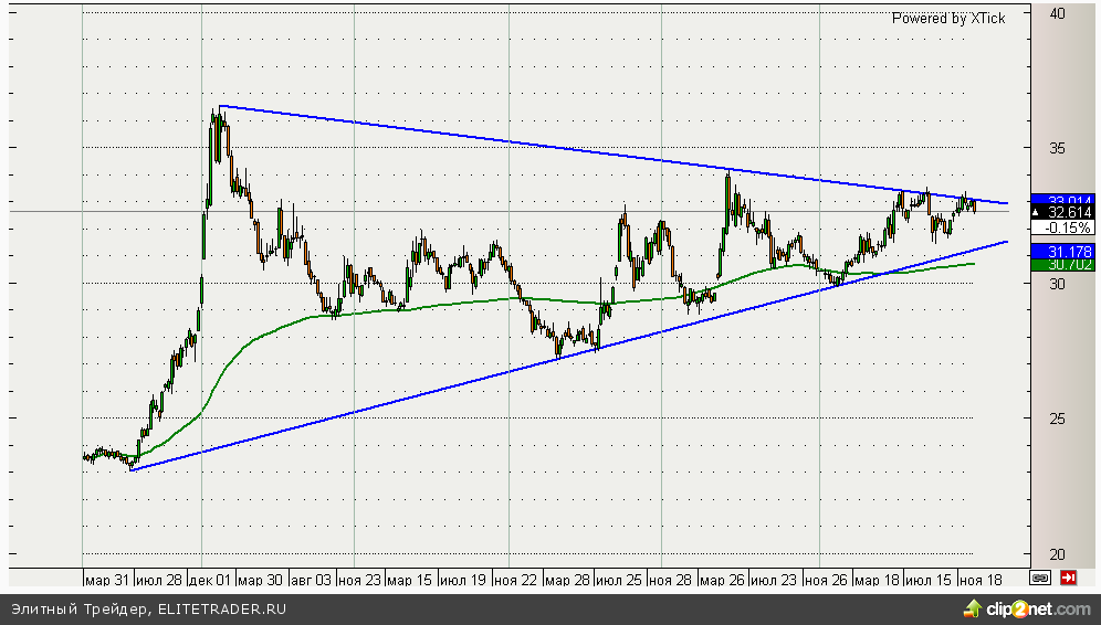 С технической точки зрения пара доллар/рубль уже несколько лет находится в сужающемся треугольнике. Выход из данной формации может произойти уже в предстоящем году и, скорее всего, в пользу роста доллара. Ближайшая цель данного движения располагается на уровне 36 руб./$.