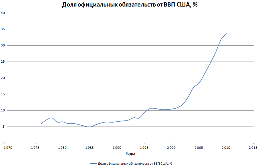 На первом графике приведена динамика доли официальных обязательств от ВВП США (Foreign official assets in the United States) от ВВП, можно легко заметить, что она активно растет с 2001 года, достигнув к концу 2010 года 34% от ВВП с 10% в 2000 году. На следующих графиках приведены суммарные активы и пассивы США без учета финансовых деривативов, которые в пассивах и активах практически равны.