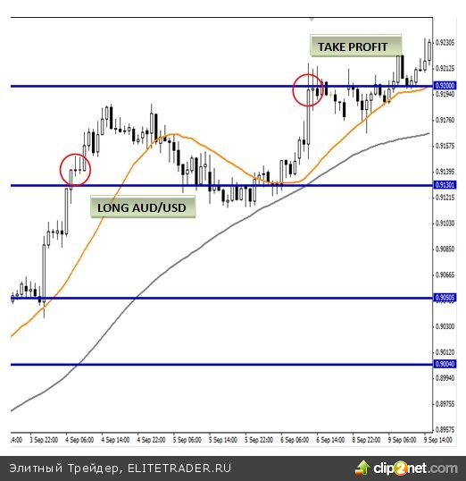 На момент написания обзора AUD/USD тестировала сильное сопротивление 0,91. В 10.00 GMT 4 сентября после подтверждения пробоя 0,9130 мы открыли позицию на отметке 0,9141. Первичной целью мы ставили отметку 0,92, которая была достигнута лишь спустя два дня 6 сентября. По итогам сделки, прирост составил 59 пунктов или 590 долларов США за два дня.