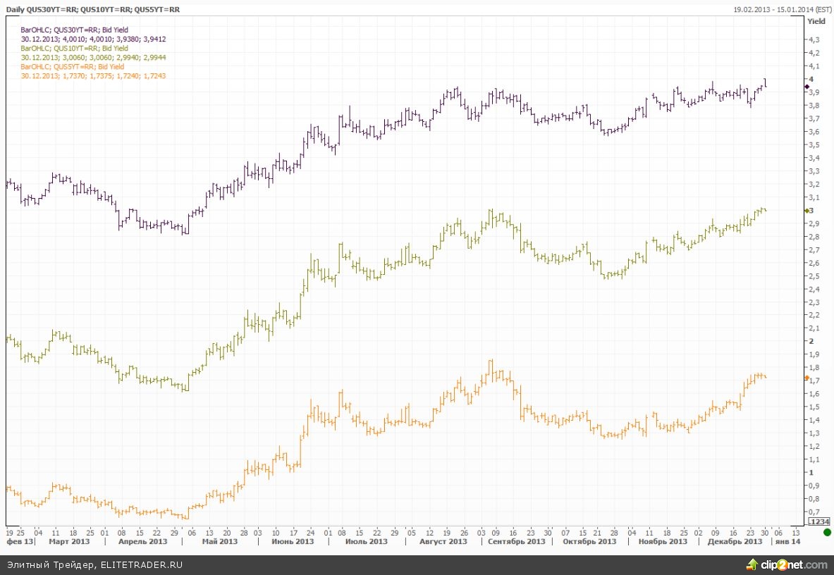 Знаменательными были торги пятницы на рынке американского госдолга, где доходность 10-летних казначейский облигаций превысила 3%. А сегодня доходность 30-летних бондов скакнула выше 4% впервые с 2011 года. В отличие от рынка акций, здесь была более адекватная реакция на объявленное сокращение Федрезервом объемов стимулирующих экономику покупок трежерис и MBS.