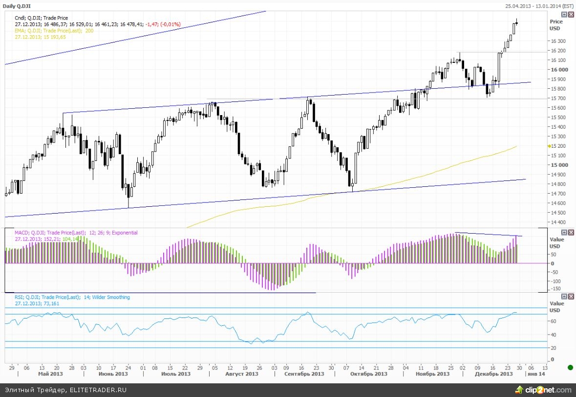 Шестидневный рост индекса голубых фишек Dow Jones в прошедшую пятницу прервался символическим снижением на 0,01%. При этом в течение дня индекс в очередной раз обновил исторические максимумы, но этот рост в рамках дневного таймфрейма отразился лишь тенью свечи, что походит на разворотный сигнал, который требует подтверждения. К настоящему моменту индекс Dow Jones поднялся на 25,8% в этом году, находясь на пути к лучшему результату с 1996 года. Впереди у американских инвесторов остается буквально две сессии в 2013 году.