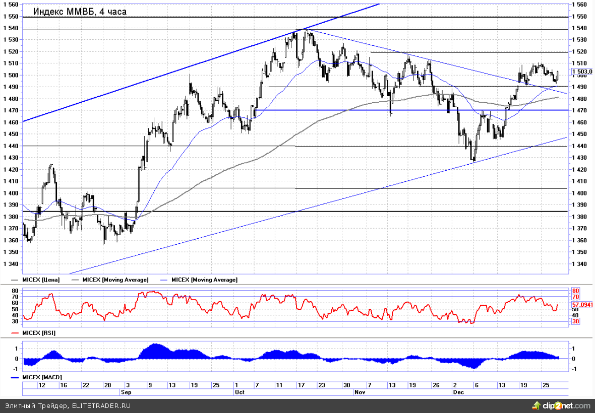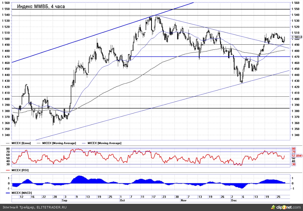 Сегодня на российском рынке будет первый торговый день в новом году. Внешние факторы к текущему моменту пока располагают преимущественно к снижению отечественных индексов. Таким образом, будет сделана попытка выйти за пределы сложившейся на нашем рынке консолидации вниз. Индекс ММВБ с самого открытия опустится под поддержку 1490п.