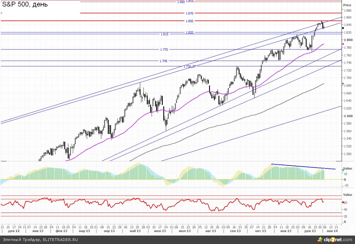 Ситуация на западных площадках в наши «неторговые» дни развивалась по самому очевидному сценарию. Сразу же после закрытия сверхпозитивного 2013 года началось что-то похожее на фиксацию длинных позиций. Однако сразу же отметим, что пока это снижение еще не переросло во что-то большее, чем очередной локальный откат. В частности индекс широкого рынка S&P 500, традиционно рассматриваемый в качестве основного западного барометра, на который ориентируются наши инвесторы, просел на 1% со своих максимумов. Разворот произошел ровно от того сопротивления на 1850, о котором мы ранее уже много раз говорили. Считаю, что не стоит рассчитывать на то, что медведям удастся вот так вот просто сломать долгосрочный up-тренд. В последних обзорах мы уже предполагали, что после полноценного отката от 1850 финальная фаза роста вполне может быть снова продолжена вплоть до 1870-1875п.