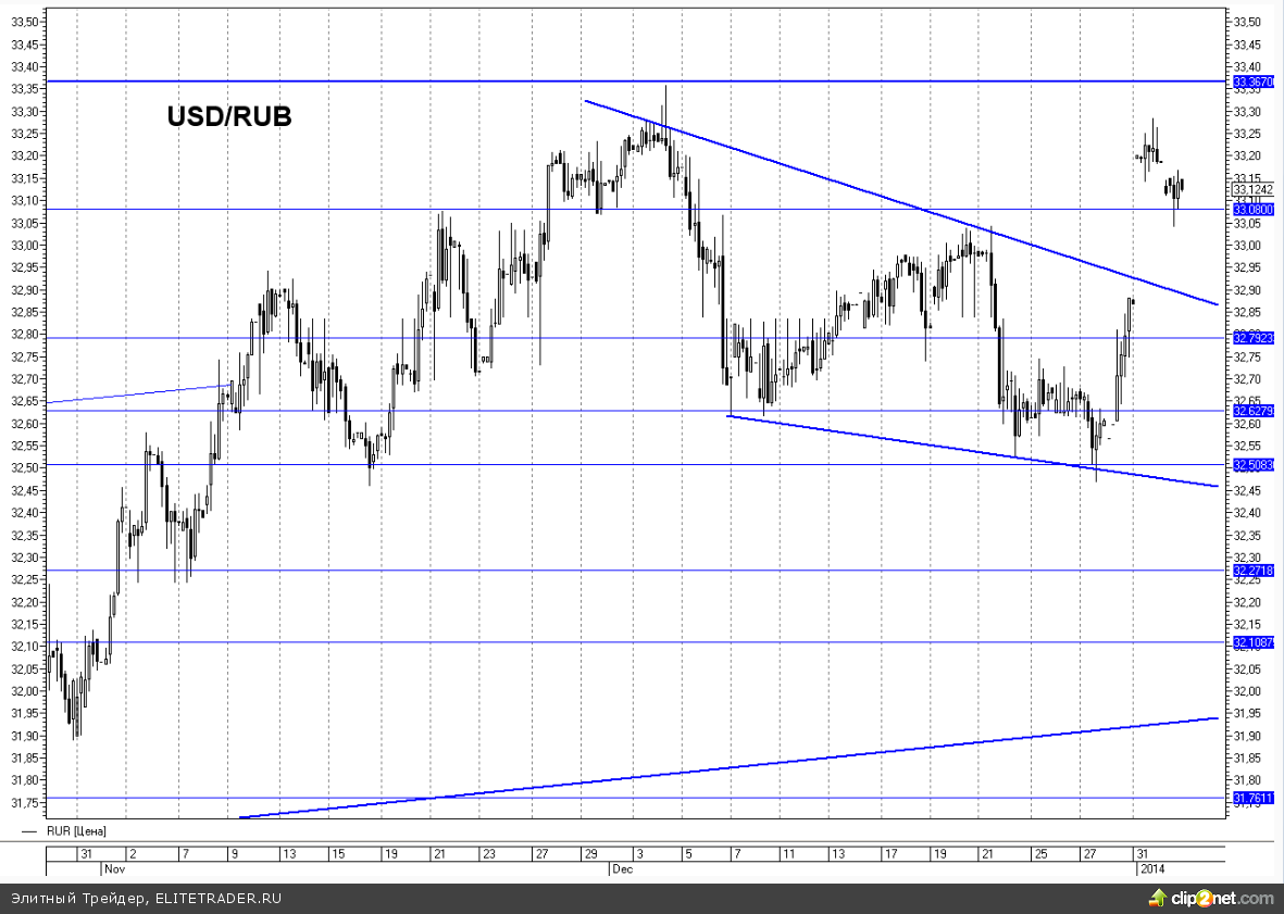 Более подробно хотелось бы остановиться на динамике валютной пары доллар/рубль, и отметить завершившуюся трехнедельную консолидацию под уровнем 33, реализация которой закономерно произошла вверх. Не смотря на то, что технических признаков для продолжения сильного ослабления рубля от текущих уровней пока нет, общая ситуация, в том числе и макроэкономическая, по-прежнему располагает к развитию подобной динамики, так что серьезных рублевых вложений пока стоит избегать, и первой среднесрочной целью потенциального ослабления сейчас видится уровень 34.