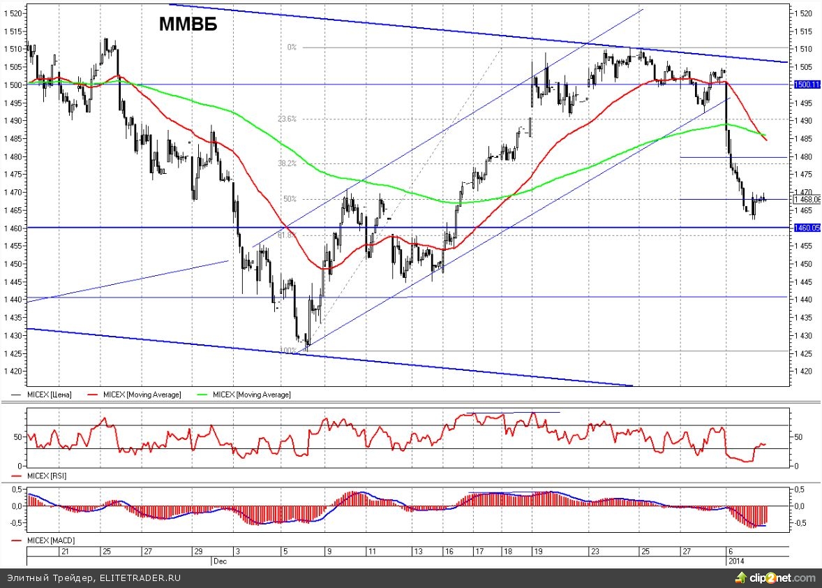 Новый год для российского фондового рынка начался довольно негативно, поскольку западные площадки в период наших новогодних праздников продемонстрировали коррекцию роста последних дней ушедшего года, и мы, соответственно, пустились «вдогонку». В результате индекс ММВБ за одну торговую сессию вернулся в район 1465 - 1470, где располагается уровень 50% коррекции по Фибоначчи к декабрьской волне роста, и подобная динамика может свидетельствовать о перспективе дальнейшего снижения после некоторой передышки, которую, собственно, мы сейчас и наблюдаем. Пока динамика проходит ниже уровня 1480, можно говорить лишь о коррекционном отскоке вверх, либо о консолидации с перспективой дальнейшего снижения, однако в противном случае картина потеряет свой строго негативный вид.