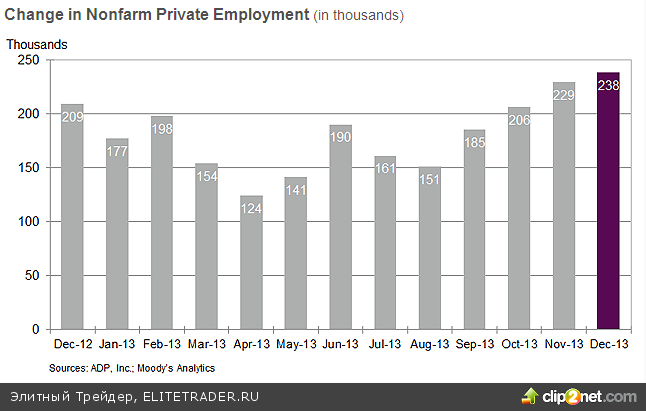 Для рынка в долгосрочной перспективе это конечно позитив, но краткосрочно, ожидания дальнейшего сокращения стимулирования Федрезервом в связи с улучшением ситуации в экономике, которое может вновь произойти уже на январском заседании, несут очевидный негатив. Данные ADP тесно кореллируют с официальными данными по Non-Farm Payrolls, которые выйдут в пятницу.