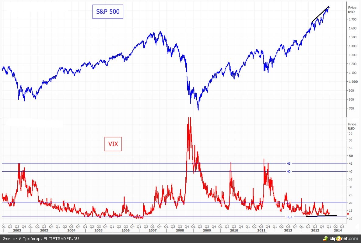 В качестве сигнала на продажу по-прежнему выделяются медвежьи дивергенции на осцилляторах разных таймфреймов (MACD и RSI). Однако сразу же замечу, что это лишь попутные сигналы, так как уже очень продолжительный период времени они очень слабо отрабатываются именно на S&P500. Также уже практически на протяжении 1 года мы наблюдаем не отрабатывающийся долгосрочный сигнал на продажу со стороны индекса страха VIX, который не обновляет минимумы на фоне растущего S&P 500.