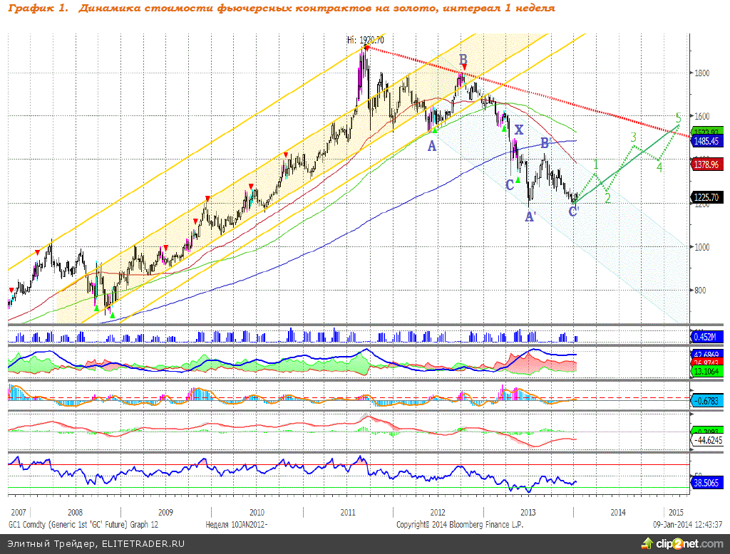 Котировки золота в декабре 2013 года вошли в диапазон значений $1180-1200 за тройскую унцию, тем самым завершая волновую структуру снижения. В начале текущего месяца котировки резко двинулись вверх, обозначив стремление к росту. В ближайшей перспективе котировки драгоценного металла могут продолжить рост. На графике 1 и 2 мы отобразили зеленой линией предполагаемую динамику стоимости контракта на золото. Полагаем, в скором времени цены на золото пойдут вверх, завершив формирование масштабной модели «двойное дно» (см. график 1), что станет сигналом к долгосрочному восходящему тренду. Индикаторы: MACD на дневном графике в настоящее время сформировал сигнал вверх.