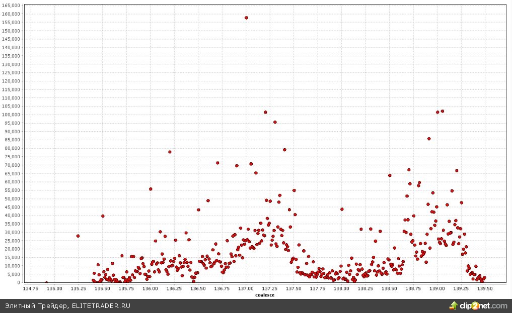 По оси x — цена, у — накопленный торговый объем. Как видите, в районе 139 000 пунктов прошел объем порядка 23 тыс. контрактов. Это много. Но импульсного выхода выше этого уровня не произошло.