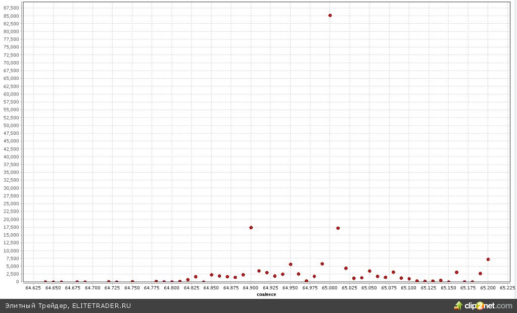 Акции Московской биржи (MOEX) сегодня продолжили торговаться под важным объемным уровнем 65 рублей. И здесь вновь громадные точечные объемы, 65 тыс. лотов: