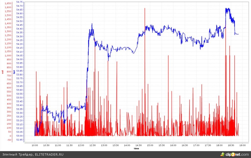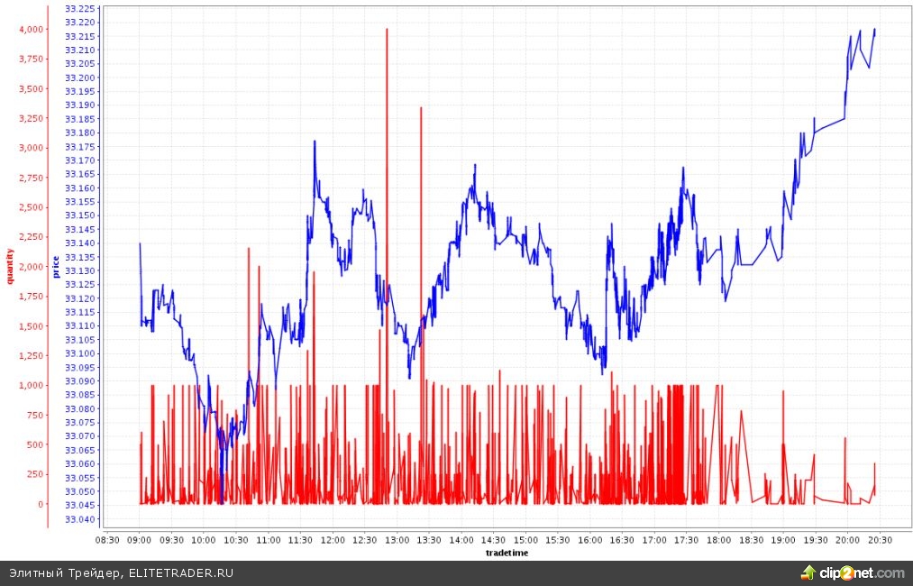 На рисунке выше по оси x — время, оси у — объем и цена (красная и синяя линии). В районе 33,1 руб. виден всплеск объема.