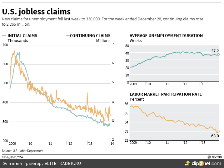 В то же время напомним, что с начала года, миллионы американцев остались без пособий по безработице, ввиду того, что Конгресс не продлил экстренную программу выплат. К слову сказать, в четверг лидер большинства в Сенате Гарри Рид заявил, что видится осторожный оптимизм, относительно того, что соглашение может быть достигнуто. При этом он видит целесообразным продлить выплаты на год, а не три месяца, но готов рассмотреть любые предложения республиканцев.