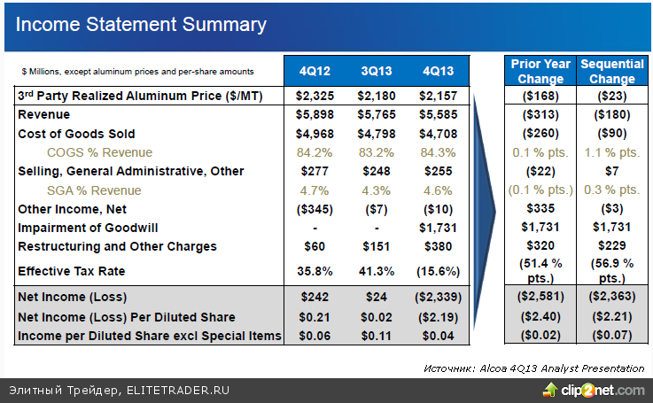 Нужно сказать, что неофициальный, но традиционный старт сезона отчетностей состоялся вчера же, но после закрытия торгов на американских площадках с публикацией отчета алюминиевого гиганта Alcoa. Первый блин вышел комом. Скорректированная чистая прибыль на акцию составила 4 цента, не дотянув до прогнозных 6 центов. В то же время выручка составила $5,585 млрд., превысив ожидаемые $5,343 млрд. В целом компания получила убыток в $2,3 млрд. В новом году компания по-прежнему ожидает рост спроса на алюминий на уровне 7%.