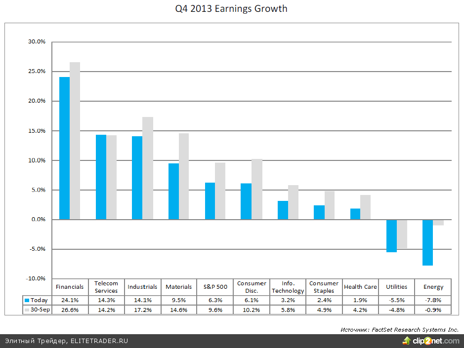 По данным Factset из 107 компаний чьи акции входят в состав индекса S&P500 прогнозы 94 на IV квартал не дотягивают до средних оценок аналитиков , тогда как 13 превышают ожидаемые цифры по EPS. Таким образом, процент компаний-эмитентов с негативным взглядом составляет 88%, что значительно выше пятилетнего среднего на уровне 64%. Однако в целом темп роста прибыли ожидается на уровне 6,3%, тогда как в начале квартала ожидалось 9,6%.