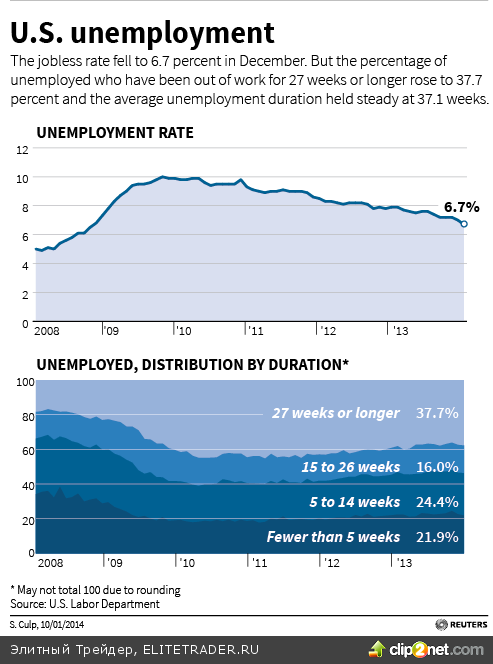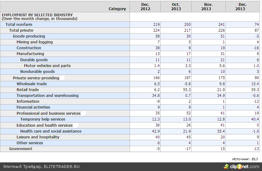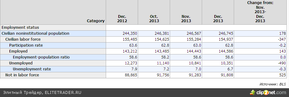 Конечно, данная статистика интересует инвесторов, прежде всего, в текущей ситуации в контексте январского решения ФРС по дальнейшему сокращению программы стимулирования. 18 из 18 опрошенных Рейтер первичных дилеров не смотря на отчет по рынку труда в январе ожидают нового шага по снижению QE еще на $10 млрд. Впрочем, с прогностической способностью консенсуса в подобных опросах как показали решения Феда в сентябре, декабре - не все гладко.
