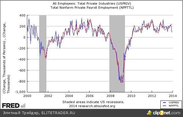 Вообще говоря, цифры ADP расходятся с официальной статистикой по частному сектору в среднем на 52 тыс., причем расхождения не склоняются в ту или иную сторону в числе случаев, а в общей сумме официальные данные более скромные почти на 350 тыс. То есть декабрьский результат обеспечил едва ли не половину подобного несоответствия, и превысил в три раза среднее отклонение.