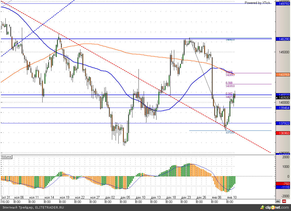 Фьючерс на индекс РТС сегодня практически не изменяется и торгуется около уровней закрытия пятницы. Данная динамика обусловлена отсутствием важных новостей в первой половине дня, а также такими противоречивыми факторами как снижение нефтяных котировок и смещение ожиданий относительно сокращения стимулирующих программ США в более плавный ритм. При этом сегодня RIH4 благополучно добрался до отметки 141000, где находится 38,2% коррекции по Фибоначчи. Поэтому снижение от этих отметок вполне может возобновиться.