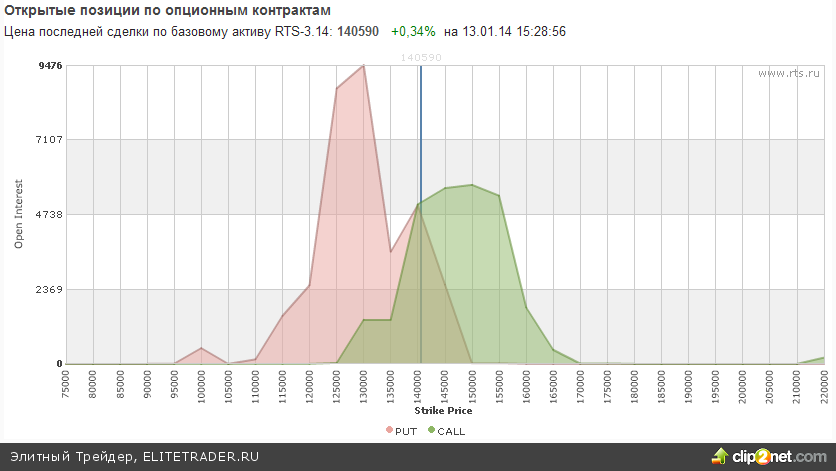 Между тем открытые опционные позиции по RIH4 со сроком исполнения 17.02.14 сейчас смотрят немного вверх. На отметке 130000 можно увидеть огромное количество опционов пут, которые выступают как очень сильная поддержка. При этом эквивалентного количества открытых опционов колл сейчас просто нет.