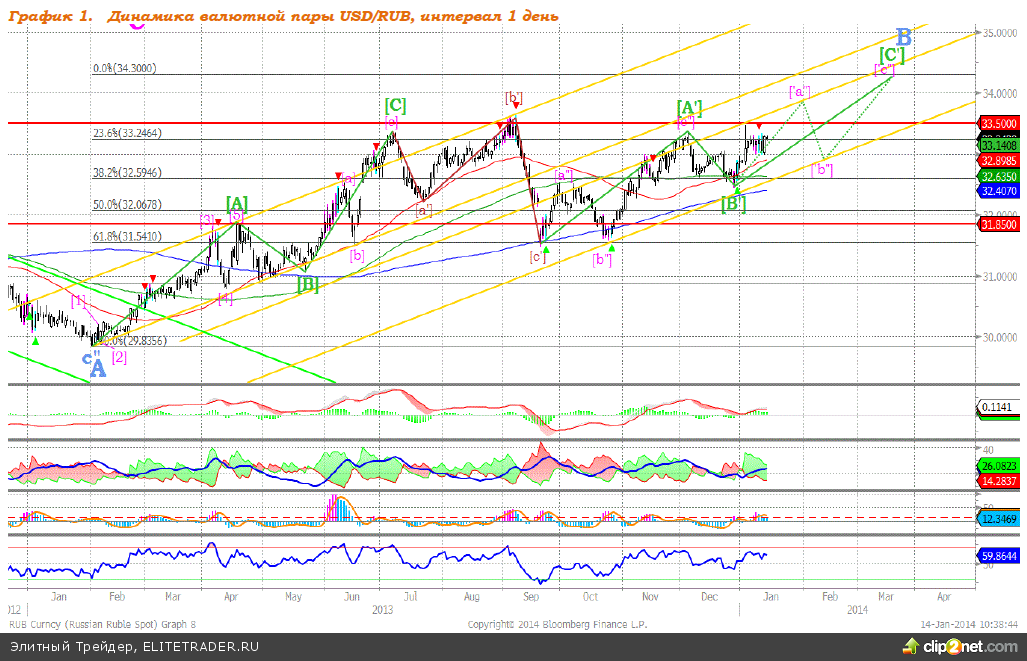 Валютная пара доллар/рубль продолжает находиться в рамках восходящего канала, который начал формироваться в начале февраля 2013 года (см График 1). Мы ожидаем продолжение формирования восходящей волны [C’]. Исходя из перехода ЦБР к режиму «плавающего валютного курса», который подразумевает прекращение целевых валютных интервенций, а также из начала сворачивания Федеральной резервной системой США программы QE3, мы предположили, что валютная пара продолжит оставаться в рамках восходящего коридора, который обозначен на графике, приведенном выше, желтыми линиями. Целью волны [C’] видим уровень 34,30 рублей за доллар. Индикаторы: MACD на дневном графике в начале января сформировал сигнал вверх. Индикатор повышения DMI+ находится выше индикатора понижения DMI-, индикатор силы тренда расположен в средней части шкалы и движется вверх, что указывает на наличие восходящего тренда. Индикатор, основанный на динамике ADX, сформировал сигнал вниз, однако восходящий тренд сильный, и сигнал может быть преждевременным. Осциллятор RSI в сентябре 2013 года побывал в зоне перепроданности, сформировав тем самым сигнал вверх, в настоящее время осциллятор остается в средней части шкалы, подтверждая наличие потенциала к росту. Рекомендуем: покупать доллар к рублю по текущей цене (33,25 рублей за доллар) с целью продать на уровне 34,30 рублей за доллар (+3,16%), стоп-приказ на отметке 33,08 рублей за доллар (-0,51%), временная перспектива составляет 2-3 месяца. Поддержка: 33,20; 33,00; 32,80; 32,50; 32,00. Сопротивление: 33,40-33,50; 33,85; 34,15; 34,30.
