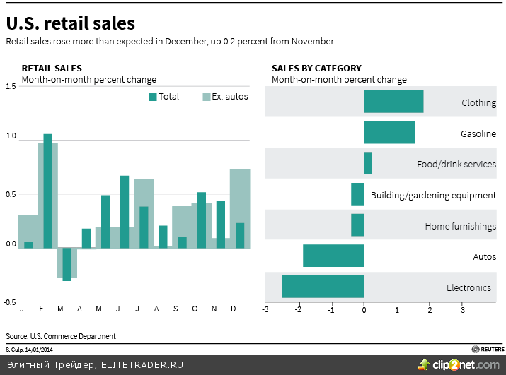 Инвесторов в некоторой степени порадовали данные по розничным продажам. Но это касается данных, исключающих продажи транспорта. Основной показатель хоть и превысил прогнозные 0,1%, показав рост на 0,2%, но это в частности стало отражением пересмотра ноябрьского роста с 0,7% до 0,4%. В номинальном выражении в ноябре первая оценка предполагала рост до $432,3 млрд., тогда как декабрьская оказалась на уровне $431,9 млрд.